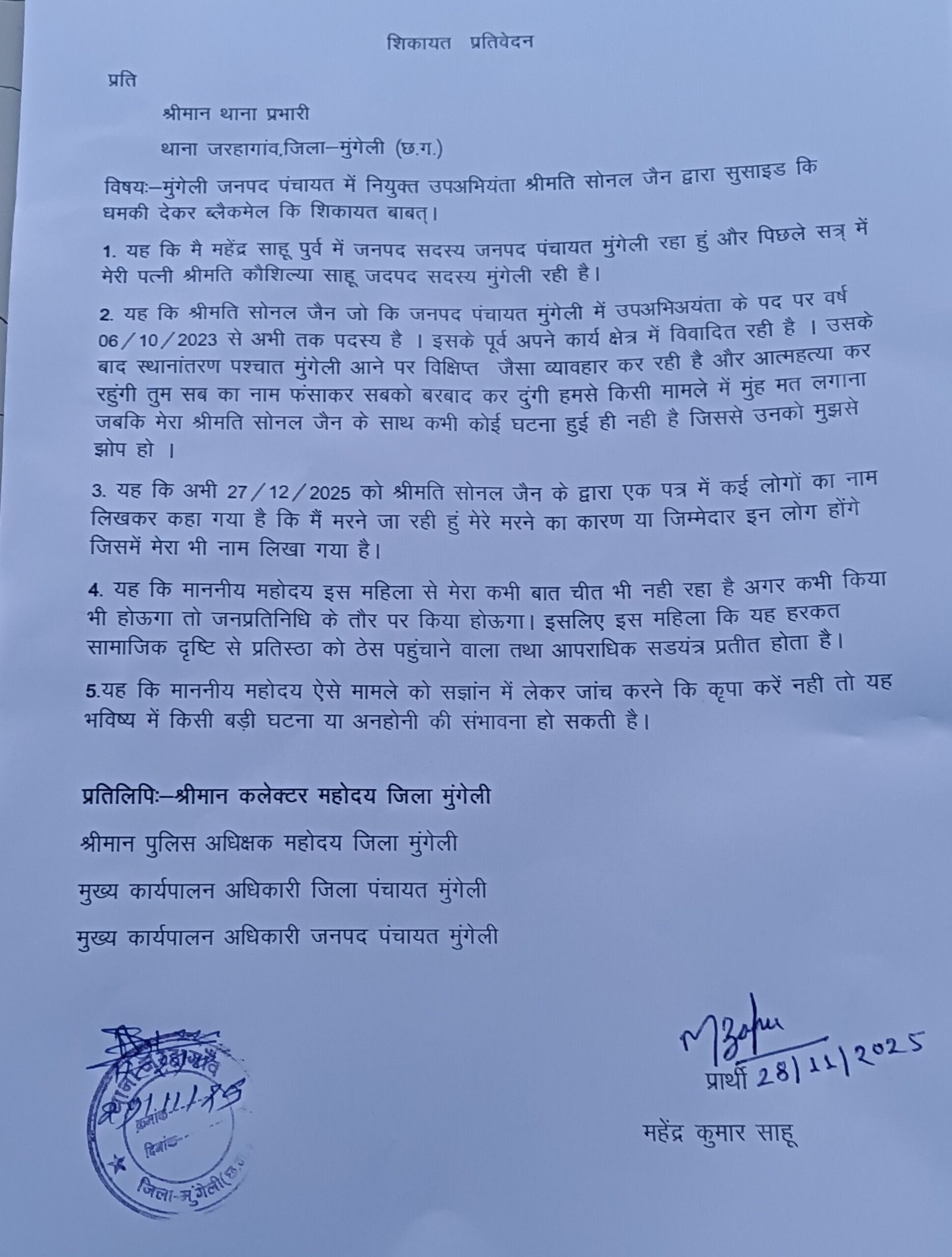 मुंगेली.. उप अभियंता सोनल जैन के षड्यंत्र से क्षुब्ध जनप्रतिनिधियों ने जंग छेड़ दी है।पूर्व में एक सुसाइड नोट वायरल हो रहा है जिसमें जनपद पंचायत के अधिकारियों , एवं जनप्रतिनिधियों द्वारा लगातार परेशान करने कारण आत्महत्या करने की बात कही गई है। सूत्रों के माने तो फिनायल पीकर जिला अस्पताल में एडमिट हो गई थी जिनके कारण जनपद कार्यालय जनप्रतिनिधियों  में तहलका मचा हुआ है।