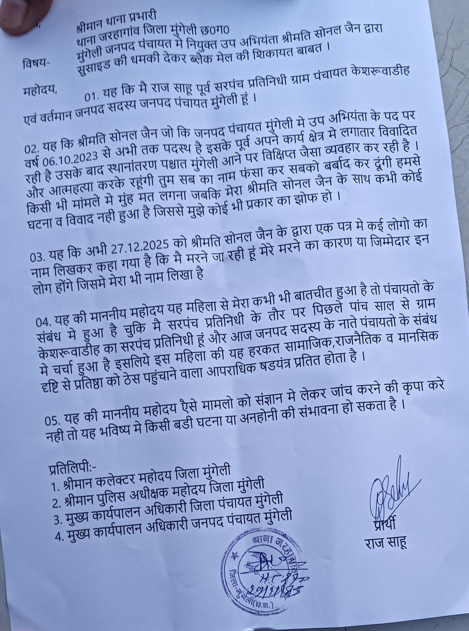 उक्त प्रकरण को लेकर जिला सदस्य उमाशंकर साहू,जनपद सदस्य राज साहू, जरहागांव नगरपंचायत अध्यक्ष प्रतिनिधि वेद प्रकाश कश्यप ने जरहागांव थाना में शिकायत पत्र सौंपा  है।ज्ञापन में तीनों ने अलग अलग लिखिए शिकायत की है जिसमें जरहा गांव पुलिस जांच में लेने की बात कही है। जिला पंचायत सदस्य पूर्व सरपंच क्षेत्र के कोसमा निवासी उमाशंकर साहू ने शिकायत पत्र में बताया कि उप अभियंता सोनल जैन से कोई बात चित नहीं रहता न लेन देन, उनके द्वारा मरने की धमकी देकर ब्लैक मेल करने की कोशिश की जा रही है जो सरासर गलत है।