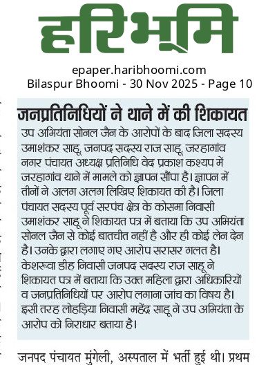 उक्त प्रकरण में जांच करने की मांग किया है। क्षेत्र के केशरूवा डीह निवासी जनपद सदस्य राज साहू ने शिकायत पत्र में बताया कि उक्त महिला सोनल जैन हमेशा से विवादित रहा है।उनके द्वारा विक्षिप्त जैसे बात किया जाना लोगो में कुतुहल आ माहौल बना रहता है सोचने वाली बात है एक। कर्मचाररियों एवं अनेक जन प्रतीनिधियो के साथ आरोप लगाना जांच का विषय है ।