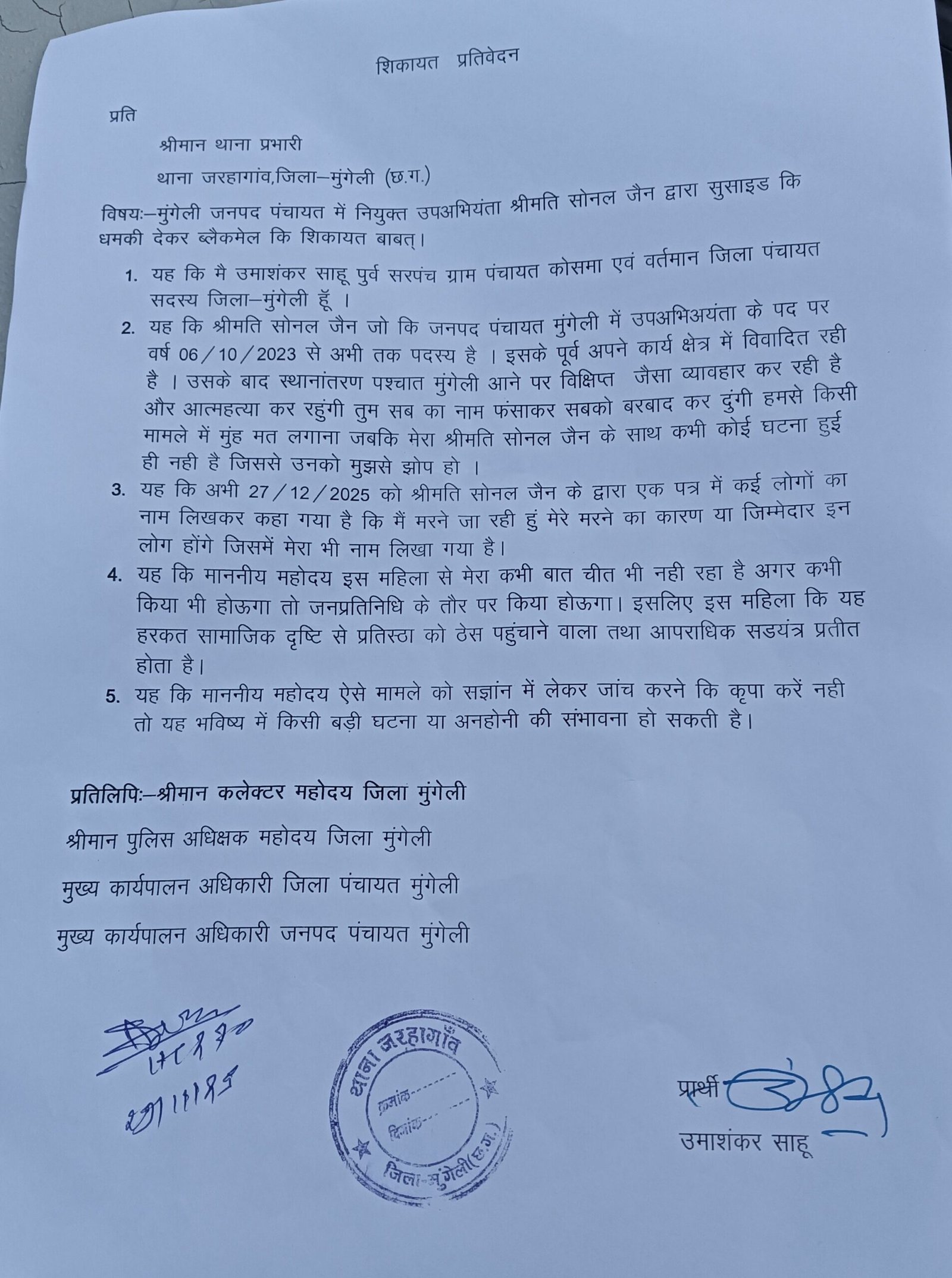 उक्त प्रकरण को लेकर जिला सदस्य उमाशंकर साहू,जनपद सदस्य राज साहू, जरहागांव नगरपंचायत अध्यक्ष प्रतिनिधि वेद प्रकाश कश्यप ने जरहागांव थाना में शिकायत पत्र सौंपा  है।ज्ञापन में तीनों ने अलग अलग लिखिए शिकायत की है जिसमें जरहा गांव पुलिस जांच में लेने की बात कही है। जिला पंचायत सदस्य पूर्व सरपंच क्षेत्र के कोसमा निवासी उमाशंकर साहू ने शिकायत पत्र में बताया कि उप अभियंता सोनल जैन से कोई बात चित नहीं रहता न लेन देन, उनके द्वारा मरने की धमकी देकर ब्लैक मेल करने की कोशिश की जा रही है जो सरासर गलत है।