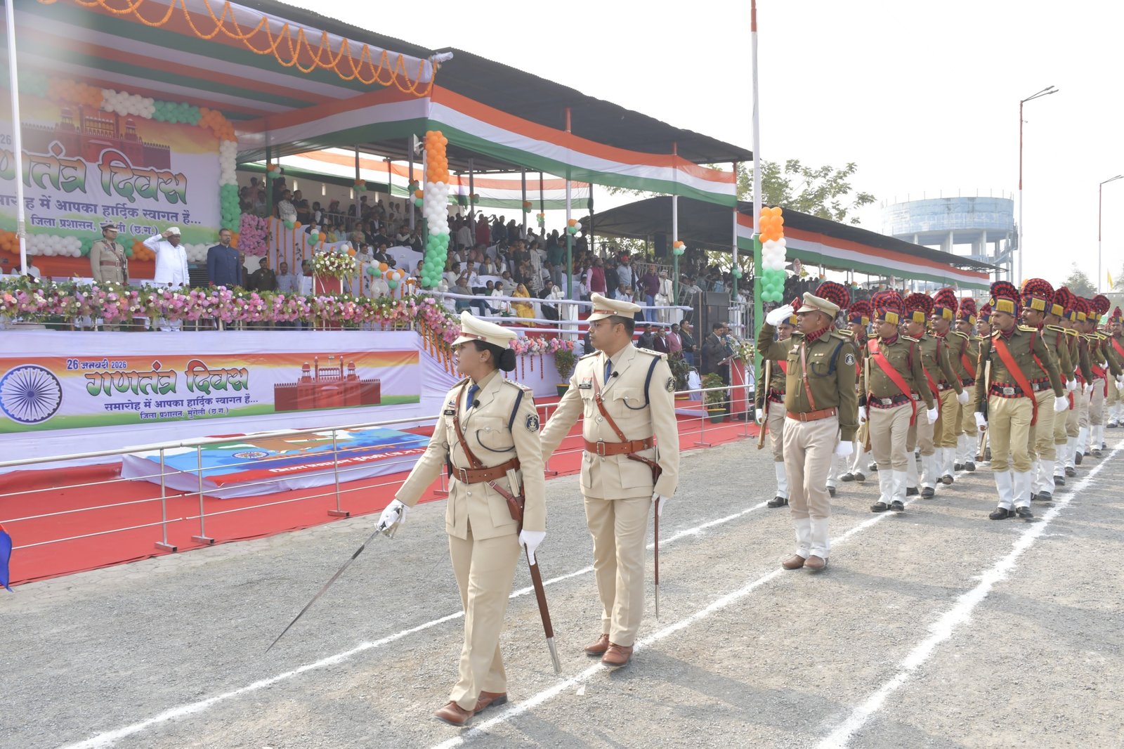 मुंगेली, / जिले में 26 जनवरी को गणतंत्र दिवस हर्षाेल्लास के साथ मनाया गया। विधायक श्री पुन्नूलाल मोहले जिला मुख्यालय मुंगेली स्थित डॉ. श्यामा प्रसाद मुखर्जी स्टेडियम में आयोजित जिला स्तरीय मुख्य समारोह में मुख्य अतिथि के रूप में शामिल हुए। उन्होंने राष्ट्रीय ध्वज फहराकर मुख्यमंत्री श्री विष्णुदेव साय द्वारा जनता के नाम प्रेषित संदेश का वाचन किया और शासन की महत्वपूर्ण उपलब्धियों, योजनाओं और कार्यक्रमों के संबंध में जानकारी दी। उन्होंने परेड का निरीक्षण किया और परेड की सलामी ली तथा जिले के नागरिकों को गणतंत्र दिवस की बधाई एवं शुभकामनाएं दी।
